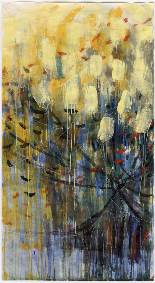 Materials: Acrylic, ink, Flashe, and white china marker on rice paper mounted on stretched canvas.